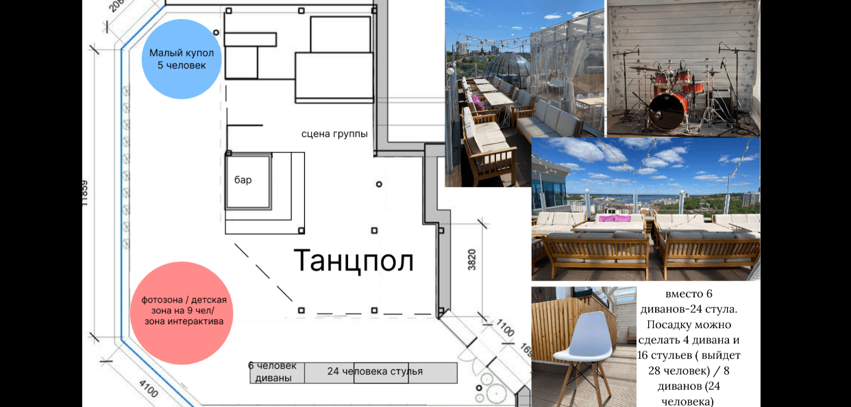 Проект купол360 - это два купола и уютная терраса под крышей. В аренду можно взять, как всю площадку целиком, так и отдельно только зону под крышей. Виды ниже представлены для полного понимания расположения объектов на террасе.